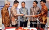 Presiden Direktur PT Tower Bersama Infrastucture Tbk (TBIG) Herman Setya Budi (tengah), Wakil Presiden Direktur Hardi Wijaya Liong (kedua kanan), Direktur & Chief Bisnis Development Budianto Purwahjo (kiri), Komisaris Independen Wahyuni Bahar (kedua kiri) dan Direktur Keuangan Helmy Yusman Santoso (kanan) berbincang usai Rapat Umum Pemegang Saham Luar Biasa (RUPLB) di Jakarta, Kamis (30/10/2019). (FOTO : AUDYALWI/ANTARA FOTO)