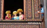 Wisatawan bergantian berfoto mengenakan pakaian tradisional Minang di objek wisata Istana Pagaruyuang, Batusangkar, Kabupaten Tanah Datar, Sumatera Barat, (FOTO : Yogi Ardhi/Republika)