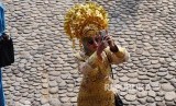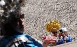 Seorang isatawan berpakaian adat sewaan memotret di objek wisata Istana Pagaruyuang, Batusangkar, Kabupaten Tanah Datar, Sumatera Barat, (FOTO : Yogi Ardhi/Republika)