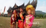 Keluarga wisatawan berfoto mengenakan pakaian adat sewaan di objek wisata Istana Pagaruyuang, Batusangkar, Kabupaten Tanah Datar, Sumatera Barat, (FOTO : Yogi Ardhi/Republika)