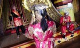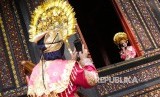 REPUBLIKA.CO.ID, BATUSANGKAR -- Replika pakaian adat ini disewakan oleh pengelola di lantai bawah Istana Pagaruyung dengan harga bervariasi. Bergantung pada kelengkapan yang dipilih. Pakaian pengantin wanita lengkap dengan hiasan sunting di kepala.