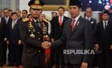 Presiden Joko Widodo berjabat tangan dengan Kapolri Jendral Idham Aziz saat pelantikan Kapolri di Istana Merdeka, Jakarta, Jumat (1/11). (FOTO : Republika/Edwin Dwi Putranto)