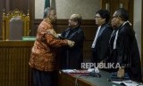 Mantan Direktur Utama PT PLN Sofyan Basir menyalami kuasa hukumnya usai pembacaan putusan di Pengadilan Tipikor, Jakarta, Senin (4/11). (FOTO : Republika/Putra M. Akbar)