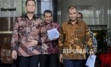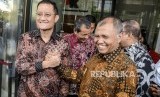 REPUBLIKA.CO.ID, JAKARTA -- Menteri Sosial Juliari Batubara bersama Ketua KPK Agus Rahardjo berjalan usai melakukan pertemuan di Gedung KPK, Jakarta, Senin (4/11). Pertemuan itu untuk membahas sinergi dalam pemberantasan korupsi.