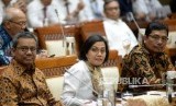 Menteri Keuangan Sri Mulyani Indrawati saat mengikuti rapat kerja dengan Komisi XI DPR di Kompleks Parlemen, Senayan, Jakarta, Senin (4/11). (FOTO : Republika/Prayogi)