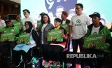 Dua Co-CEO Gojek, Kevin Aluwi (ketiga kiri) dan Andre Soelistyo (kedua kanan) berfoto bersama 9 mitra Gojek yang menginspirasi di Jakarta, Sabtu (2/11). Penghargaan ini diberikanKesembilan mitra Gojek ini ada yang menjadi mitra Go Ride, Go Send, Go Car, merchant Go Food, dan Go Life dalam rangkaian peringatan 9 tahun berdirinya decacorn ini. (FOTO : Yogi Ardhi/Republika)