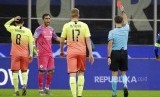 Wasit Aleksei Kulbakov, mengganjar kiper City Claudio Bravo kartu merah pada laga Liga Champions grup C antara Atalanta melawan Manchester City di San Siro stadium, Milan, Italia, Kamis (7/11) dinihari. (FOTO : AP Photo/Luca Bruno)