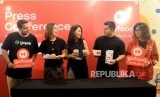 Senior Marketing Manager GoFood Marsela Renata (kanan) berbincang dengan Co-Owner Mangkok Ku Randy Julius (dua Kanan), Co-Founder and COO Fore Coffee Elisa Suteja (tengah), Head of Marketing CFC Fiska Rieslianti (dua kiri) dan SVP Commercial Expansion Gojek Johan Surani usai memberikan keterangan perkembangan terkini GoFood Exclusive di Jakarta, Kamis (7/11). (FOTO : Republika/Prayogi)