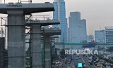 Sejumlah kendaraan bermotor melintas dengan latar belakang pembangunan 'longspan' atau bentangan beton panjang lintasan Light Rail Transit (LRT) di Kuningan, Jakarta, Kamis (7/11/2019). (FOTO : Antara/Aditya Pradana Putra)