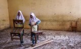 Dua orang siswa membawa kursi dari kelas SMPN 1 Ngamprah yang terdampak proyek kereta cepat Jakarta-Bandung di Padalarang, Kabupaten Bandung Barat, Jawa Barat, Kamis (7/11/2019) (FOTO : Antara/Raisan Al Farisi)