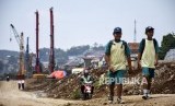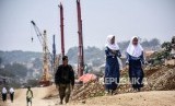 Sejumlah murid dan warga berjalan dengan latar belakang proyek Kereta Cepat Jakarta Bandung (KCJB) di Ngamprah, Kabupaten Bandung Barat, Kamis (7/11). (FOTO : Abdan Syakura_Republika)