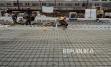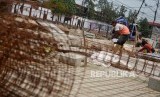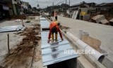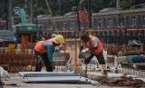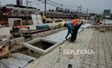 Pekerja menyelesaikan proyek pembangunan jalan inspeksi di Jalan Kemuning, Pasar Minggu, Jakarta, Selasa (12/11/2019). (FOTO : Republika)