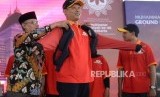 Peluncuran SM Logistik. Ketua Umum PP Muhammadiyah Haedar Nashir memikaikan jaket operasional pada peluncuran SM Logistik di sela peletakan batu pertama pembangunan Menara Suara Muhammadiyah (SM) di Yogyakarta, Ahad (17/11). (FOTO : Republika/ Wihdan)
