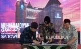 Kerjasama SM dan Republika. Direktur Operasioanal Republika Media Mandiri Arys Hilman Nugraha, Direktur Suara Muhammadiyah Deni Asyari, dan Direktur tv Muhammadiyah Brilianto K. Satria Jaya (dari kiri) menandatangani naskah kerjasama antara SM dengan Republika di sela acara peletakan batu pertama pembangunan Menara Suara Muhammadiyah (SM) di Yogyakarta, Ahad (17/11). (FOTO : Republika/ Wihdan)