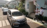 Director of Business Innovation and Sales & Marketing PT Honda Prospect Motor (HPM) Yusak Billy (kiri) didampingi Communicatuon Strategy Manager PT HPM Adhi Parama Sugarda mengibarkan bendara saat melepas peserta “Honda Mobilio Joyful Weekend” di Kantor Pusat HPM Jakarta untuk menuju Taman Budaya Sentul, Bogor, Sabtu (16/11). (FOTO : darmawan / republika)