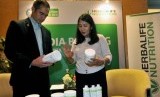 Senior Director & General Manager Herbalife Nutrition Indonesia Andam Dewi (kanan) berbincang bersama Vice President Medical Affairs Nutrition Education Herbalife Nutrition Kent L. Bradley, disela media briefing Wellness Tour 2019, di Jakarta, Sabtu (16/11/2019). (FOTO : ANTARA)