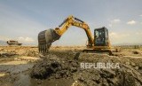 Pekerja mengeruk tanah menggunakan alat berat pada pekerjaan rehabiltasi tambak garam di Palu, Sulawesi Tengah, Minggu (17/11/2019). (FOTO : Basri Marzuki/ANTARA FOTO)