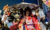 Cosplayer menghampiri pengunjung saat acara Jakarta Cosplay Parade 2019 di kawasan Monumen Nasional (Monas), Jakarta, Ahad (17/11). (FOTO : Republika/Putra M. Akbar)