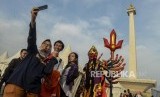 Warga berfoto bersama cosplayer saat acara Jakarta Cosplay Parade 2019 di kawasan Monumen Nasional (Monas), Jakarta, Ahad (17/11). (FOTO : Republika/Putra M. Akbar)