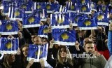Pendukung kosovo membawa poster bergambarkan bendera nasional mereka pada laga kualifikasi Euro 2020 Grup A antara Kosovo dan England di Stadion Fadil Vokrri, Pristina, Kosovo, Senin (18/11) dini hari. (FOTO : Boris Grdanoski/AP Photo)