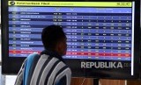 Warga mengamati jadwal kereta api pada layar elektronik di Stasiun KA Pasar Senen, Jakarta, Senin (18/11/2019). (FOTO : Antara/Aditya Pradana Putra)