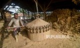 Pekerja mengunci kuali saat melakukan penyulingan minyak akar wangi di Desa Sukakarya, Samarang, Kabupaten Garut, Jawa Barat, Senin (18/11/2019). (FOTO : Antara/Raisan Al Farisi)