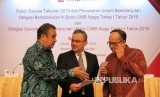 Direktur Strategy and Finance CIMB Niaga Lee Kai Kwong (tengah) berbincang dengan Direktur Business Banking CIMB Niaga Rahardja Alimhamzah (kanan) dan Direktur Syariah Banking CIMB Niaga Pandji P. Djajanegara (kiri) disela acara Public Expose CIMB Niaga di Jakarta, Senin (18/11). (FOTO : Darmawan/Republika)