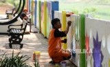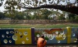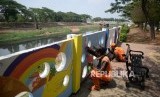 Petugas PPSU kelurahan Pondok Bambu membuat mural di tembok halte sepeda kawasan Banjir Kanal Timur (BKT), Jakarta, Rabu (20/11). (FOTO : Republika/Prayogi)