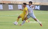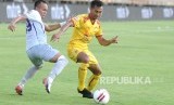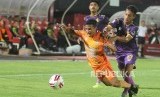 Pesepak bola Persik Kediri Romario Roberto Rumpaisum (kanan) berebut bola dengan pesepak bola Persiraja Eriyanto (kiri) saat pertandingan semi final Liga 2 2019 di Stadion Kapten I Wayan Dipta, Gianyar, Bali, Jumat (22/11/2019). (FOTO : FIKRI YUSUF/ANTARA FOTO)