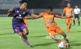 Pesepak bola Persik Kediri Alfian Agung Prastyo (kanan) berebut bola dengan pesepak bola Persiraja Defri Rizki (kiri) saat pertandingan semi final Liga 2 2019 di Stadion Kapten I Wayan Dipta, Gianyar, Bali, Jumat (22/11/2019). (FOTO : FIKRI YUSUF/ANTARA FOTO)