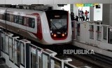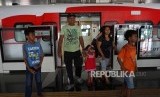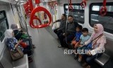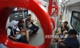 Warga berada di dalam kereta Light Rail Transit (LRT) di Stasiun Velodrome Rawamangun, Jakarta, Ahad (1/12). (FOTO : Republika/Prayogi)