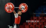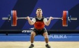 Lifter Putra Indonesia Eko Yuli Irawan melakukan pengangkatan saat pertandingan cabang olahraga angkat besi kategori putra 61 kilogram di RSMC Ninoy Aquino Stadium, Manila, Filipina, Senin (2/12). (FOTO : Republika/Putra M. Akbar)