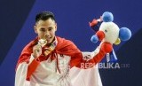 Lifter Putra Indonesia Eko Yuli Irawan usai memenangkan pertandingan cabang olahraga angkat besi kategori putra 61 kilogram di RSMC Ninoy Aquino Stadium, Manila, Filipina, Senin (2/12). (FOTO : Republika/Putra M. Akbar)