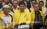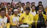 Ketua Umum Partai Golkar Airlangga Hartarto menyampaikan keterangan saat menyerahkan berkas pendaftaran calon ketua umum (caketum) Partai Golkar di DPP Partai Golkar, Jakarta, Senin (2/12). (FOTO : Republika/Prayogi)