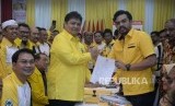 Ketua Umum Partai Golkar Airlangga Hartarto menyerahkan berkas pendaftaran calon ketua umum (caketum) Partai Golkar di DPP Partai Golkar, Jakarta, Senin (2/12). (FOTO : Republika/Prayogi)