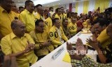 Wakil Koordinator Bidang (Wakorbid) Pratama Partai Golkar Bambang Soesatyo (kedua kiri) menyerahkan berkas pendaftaran bakal calon ketua umum (caketum) Partai Golkar kepada Ketua Komite Pemilihan Maman Abdulrahman (kedua kanan) di DPP Partai Golkar, Jakarta, Senin (2/12/2019). (FOTO : Antara/Puspa Perwitasari)
