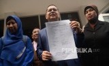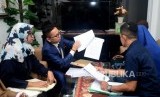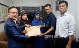 Penasihat hukum korban First Travel Pitra Romadoni Nasution bersama perwakilan korban First Travel memberikan berkas penyampaian informasi di pos pelayanan hukum dan penerimaan pengaduan masyarakat kantor Kejaksaan Agung di Jakarta, Selasa (3/12). (FOTO : Republika/Prayogi)