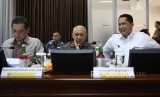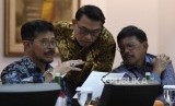 Menteri Perdagangan Agus Suparmanto (kiri) bersama Menteri Koperasi dan UKM Teten Masduki (tengah) dan Kepala Bulog Budi Waseso (kanan) mengikuti rapat terbatas tentang pengelolaan cadangan beras pemerintah di Kantor Presiden, Jakarta, Rabu (4/12/2019). (FOTO : PUSPA PERWITASARI/ANTARAFOTO)