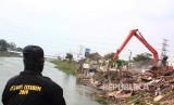 Anggota Satgas Citarum mengoperasikan alat berat saat penertiban bangunan liar di bantaran Sungai Kalimalang Saluran Tarum Barat, Karawang, Jawa Barat, Rabu (4/11/2019). Penertiban bangunan liar tersebut bertujuan untuk merehabilitasi dan mencegah pencemaran sungai Citarum. (FOTO : Ibnu Chazar/Antara)