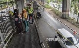 Sejumlah pejalan kaki melintasi JPO (Jembatan Penyeberangan Orang) di Jalan Ahmad Yani, Jatinegara, Jakarta Timur, Rabu (4/12/2019). Menurut petugas pembatas JPO rusak akibat ditabrak truk kontainer pada dini hari tadi pukul 03.45 WIB. (FOTO : Fakhri Hermansyah/Antara)