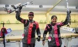 Atlet menembak Indonesia Vidya Rafika Rahmatan Toyyiba (kanan) dan Fathur Gustafian (kiri) mengangkat tembakannya usai babak final cabang olahraga menembak kategori 10 meter air rifle mixed team di Philipine Marine Shooting Range Total, Filipina, Kamis (5/12). (FOTO : Republika/Putra M. Akbar)