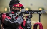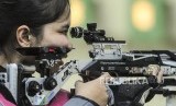 Atlet menembak Indonesia Vidya Rafika Rahmatan Toyyiba saat membidik target pada babak final cabang olahraga menembak kategori 10 meter air rifle mixed team di Philipine Marine Shooting Range Total, Filipina, Kamis (5/12). (FOTO : Republika/Putra M. Akbar)