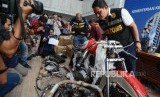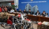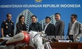 Petugas mengecek barang bukti temuan Motor harley Davidson saat konferensi pers di Gedung Kementerian Keuangan, Jakarta, Kamis (5/12). (FOTO : Thoudy Badai_Republika)