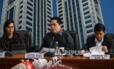 Menteri Badan Usaha Milik Negara (BUMN) Erick Thohir bersma Menteri Keuangan Sri Mulyani saat konferensi pers di Gedung Kementerian Keuangan, Jakarta, Kamis (5/12). (FOTO : Thoudy Badai_Republika)