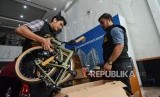 Petugas mengecek barang bukti temuan 2 unit sepeda merk Brompton saat konferensi pers di Gedung Kementerian Keuangan, Jakarta, Kamis (5/12). (FOTO : Thoudy Badai_Republika)