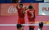 Pesepak takraw Indonesia Saiful Rijal (kiri) beraksi bersama rekannya Muhammad Hardiansyah Muliang (kanan) setelah berhasil meraih angka atas lawannya pesepak takraw Myanmar Aung Naing Oo - Zin Min Oo dalam pertandingan babak Final Sepak Takraw Ganda Beregu Putra SEA Games ke-30 di Subic Gymnasium, Filipina, Kamis (5/12/2019). (FOTO : Nyoman Budhiana/ANTARA FOTO)