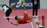 Pesepak takraw Indonesia Muhammad Hardiansyah Muliang (depan) memblok smes dari pesepak takraw Myanmar Aung Naing Oo dalam pertandingan babak Final Sepak Takraw Ganda Beregu Putra SEA Games ke-30 di Subic Gymnasium, Filipina, Kamis (5/12/2019). (FOTO : Nyoman Budhiana/ANTARA FOTO)
