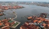 Foto aerial suasana permukiman warga yang tergenang air rob di Desa Pasir Sari, Pekalongan, Jawa Tengah, Kamis (5/12/2019). Untuk mengurangi banjir rob, Pemerintah Kabupaten Pekalongan melakukan pembangunan tanggul sepanjang empat kilometer di kawasan pesisir Kabupaten Pekalongan. (FOTO : Oky Lukmansyah/Antara)
