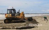 Pekerja membersihkan sampah dan limbah batu bara yang mencemari kawasan pantai di Desa Peunaga Pasi, Kecamatan Meureubo, Aceh Barat, Aceh, Kamis (5/12/2019). Perusahaan Tambang Batu Bara PT Mifa Bersaudara melakukan pembersihan sampah dan limbah batu bara yang belum jelas kepemilikannya sebagai bentuk tanggungjawab sosial. (FOTO : Syifa Yulinas/Antara)