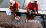 Petugas menunjukkan benih ikan Nila (Oreochromis niloticus) varietas Larasati di kolam Loka Perbenihan dan Budidaya Ikan Air Tawar (PBIAT) Ngrajek, Mungkid, Magelang, Jawa Tengah, Jumat (6/12/2019). (FOTO : ANIS EFIZUDIN)